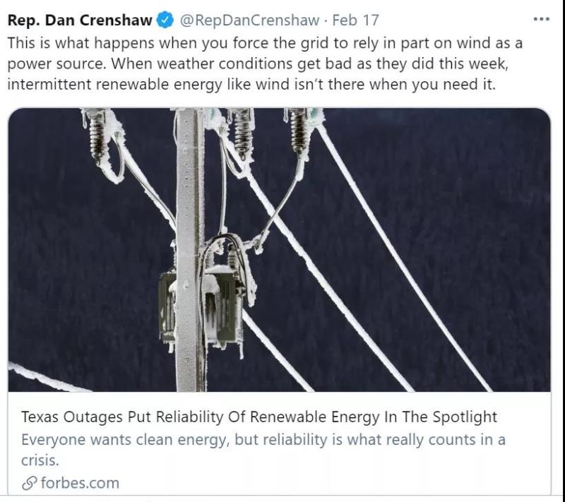 據(jù)《經(jīng)濟學(xué)人》報道,美國德克薩斯州的共和黨眾議員丹·克倫肖(DAN CRENSHAW)在2月17日的推特上說:“間歇性的可再生能源,如風能,在你需要的時候是不存在的?!?