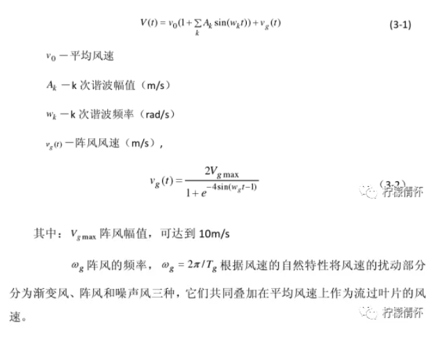 風力發(fā)電的基本模型如圖 3‐2 所示,由于風力發(fā)電主要是由風機驅動。因此,要了解風力電源對微電網的影響,首先應該了解風能的特性。風速模型的建立比較復雜,根據不同的研究目的應該建立不同的風速模型。一般來說,用于風力發(fā)電對電網影響分析的風速模型需要進行一些簡化。將風速分為兩部分,即起決定性作用的平均風速和疊加在平均風速上的各種擾動部分。因此風速模型可以表示成一系列頻率在 0.1-10Hz 的諧波分量總和。