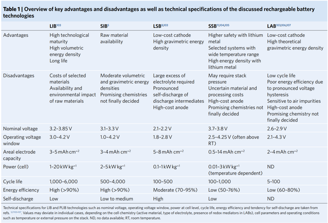 近年來為了滿足對于高能量密度的進(jìn)一步需求,人們開發(fā)了多種新型的儲(chǔ)能電池,這些電池能量密度最高可達(dá)1200Wh/kg以上,體積能量密度可達(dá)800Wh/L以上,同時(shí)這些電池還通過采用低成本的原材料(如Na、S和O等)獲得了低成本的優(yōu)勢,下表中作者對比了主要的幾種新型儲(chǔ)能電池的優(yōu)劣勢。