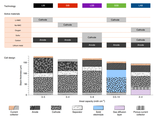 下圖中作者將幾種主要的新型電池的材料和電池結(jié)構(gòu)與鋰離子電池進(jìn)行了對比,之所以選擇這幾種電池主要是因?yàn)橛捎阡囐Y源的限制Na離子電池被認(rèn)為是一種取代鋰離子電池的選擇,而Li-S電池的理論能量密度可達(dá)2510Wh/kg以上,遠(yuǎn)高于傳統(tǒng)的鋰離子電池,全固態(tài)電池被認(rèn)為是解決鋰枝晶生長和改善電池安全性的有效方法,因此近年來得到了廣泛的關(guān)注。Li-空電池由于正極直接來自空氣中的O2,因此理論能量密度可達(dá)3400Wh/kg,是目前能量密度最高的電化學(xué)體系。