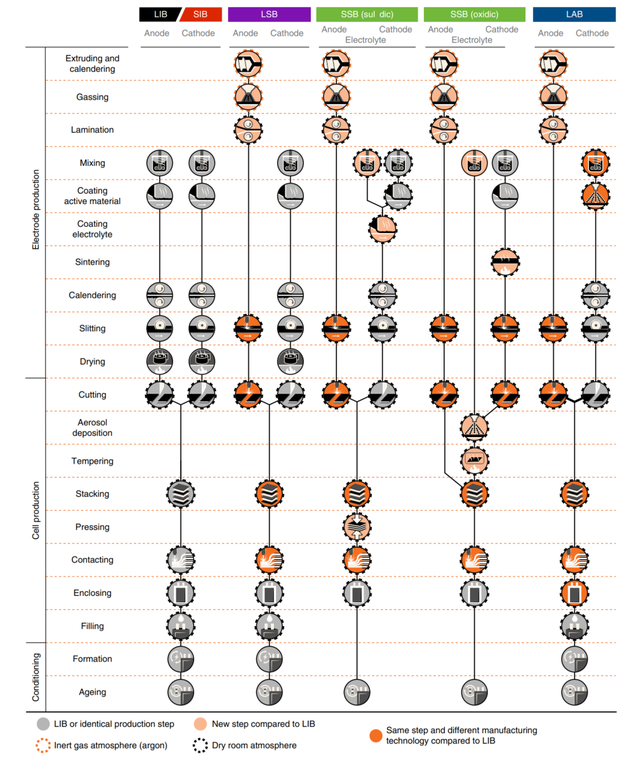 除了上述電池體系上的區(qū)別,作者還對幾種電池生產(chǎn)過程進(jìn)行了對比,由于采用了新的體系和材料,因此在生產(chǎn)工藝上也需要進(jìn)行較多的調(diào)整。作者將整個(gè)生產(chǎn)過程分為了三個(gè)大的過程:1)電極制備;2)電池生產(chǎn);3)化成。