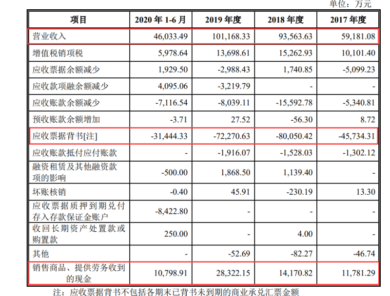 對于為何天力鋰能的營業(yè)收入與銷售商品、提供勞務收到的現(xiàn)金之間有如此巨大的差額,天力鋰能詳細披露了二者的勾稽關系,其中影響最大的因素為“應收票據(jù)背書”。2017年度至2019年度,天力鋰能的應收票據(jù)背書金額分別為4.57億元、8億元和7.23億元。
