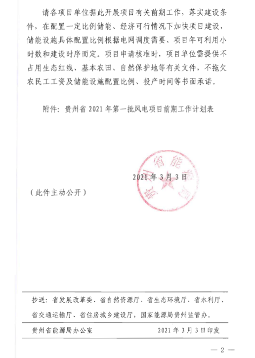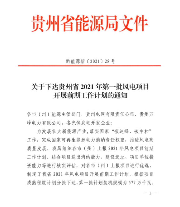 關(guān)于下達(dá)貴州省2021年第一批風(fēng)電項目開展前期工作計劃的通知