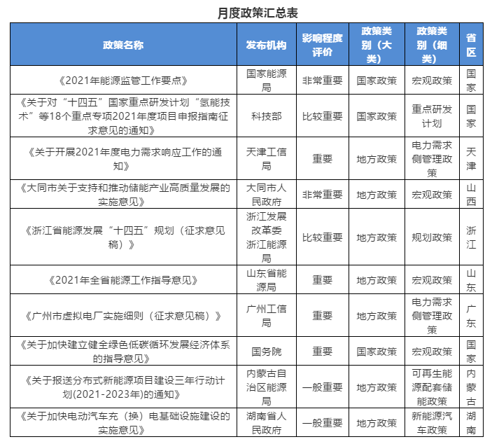同月,《浙江省能源發(fā)展“十四五”規(guī)劃(征求意見稿)》超前公布,規(guī)劃明確了先進儲能技術與應用要實現(xiàn)跨越式發(fā)展,提出了當前儲能發(fā)展面臨的核心問題,有意推動儲能技術研發(fā)和應用,并開展各類一體化工程建設。而在電力市場化進程中,電力需求側(cè)管理和可再生能源市場參與機制、輔助服務市場化機制等將是推動區(qū)域儲能商業(yè)化應用的關鍵。山西省大同市印發(fā)《大同市關于支持和推動儲能產(chǎn)業(yè)高質(zhì)量發(fā)展的實施意見》,再次提出了增量新能源項目儲能配置比例要求(配置比例不低于5%),并充分考慮了儲能產(chǎn)品市場應用的準入標準,財政補貼和市場機制將是激發(fā)用戶側(cè)和“新能源+儲能”應用活力的重要抓手。與此同時,山西省有關領導已督辦相關部門落實儲能發(fā)展市場化機制,全省儲能發(fā)展支持政策有望出臺。規(guī)劃和宏觀指導意見兩類政策將成為2021年各地區(qū)儲能政策發(fā)布的主要形態(tài),一方面各地“十四五”規(guī)劃將劍指儲能產(chǎn)業(yè)發(fā)展和技術應用,另一方面各地將細化政策措施,全面指導儲能產(chǎn)業(yè)化發(fā)展和商業(yè)化應用。儲能政策的常態(tài)化落地預示著“元年”的到來。
