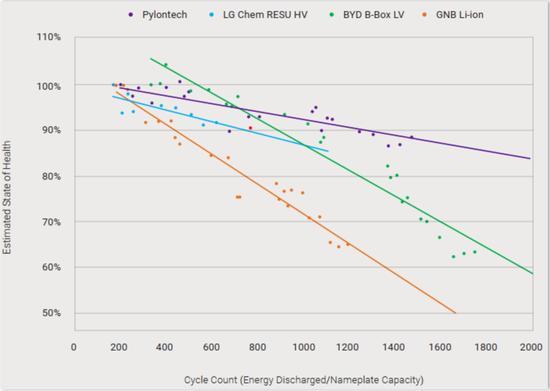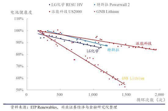 再看幾家產(chǎn)品的循環(huán)壽命,派能的產(chǎn)品性能優(yōu)勢明顯,在1500次使用后仍能具備90%壽命,與特斯拉和LG1000次使用后的健康度不相上下。