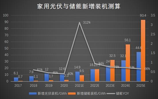2020年,全球家用儲能新增裝機容量為2.3GWh,綜合IEA、US DOE、Woodmac等著名能源部門和研究機構的預測,由于光伏滲透率與光伏儲能配套率的同步快速提升,預計2025年全球家用儲能新增裝機容量可以達到93.4GWh。