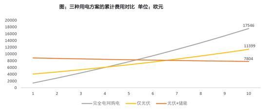德國是高電費國家,也是光伏與儲能系統(tǒng)走在最前列的國家,且他的政策要求了電池系統(tǒng)必須具有10年質(zhì)保期。因而我們以德國為例,根據(jù)Solarpower EU的數(shù)據(jù),德國家庭在30%補貼的情況下,十年的費用測算對比如下。