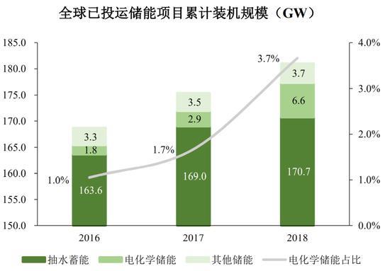 而電化學儲能憑借建設周期短、應用范圍廣、成本持續(xù)降低等諸多優(yōu)點,從2013年到2018年,在電力系統(tǒng)的新增裝機規(guī)模由0.1GW增加至3.7GW,累計裝機規(guī)模6.6GW,占比整體儲能裝機規(guī)模的份額極速上升。并且占比依然很小,方興未艾,發(fā)展?jié)摿O大。