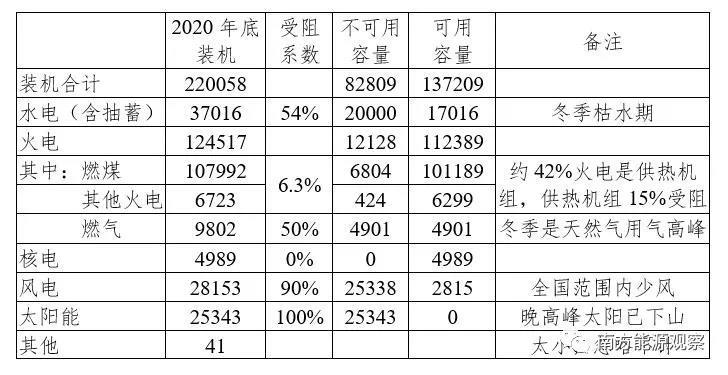 趙秘書長明確說明了水電、燃?xì)?、風(fēng)電、光伏的實(shí)際出力(可用容量)。本文估算了煤電、其他火電(余熱余壓余氣、垃圾、生物質(zhì)等)、核電的可用容量。參考2018年的數(shù)據(jù),我國的火電裝機(jī)里,42%為供熱機(jī)組;考慮到冬季供熱,供熱機(jī)組按照15%受阻考慮,燃煤、其他火電按6.3%受阻考慮,則燃煤機(jī)組可用容量101189萬千瓦,其他火電可用容量6299萬千瓦。核電不受阻,可用容量4989萬千瓦。合計(jì)可用容量13.72億千瓦。