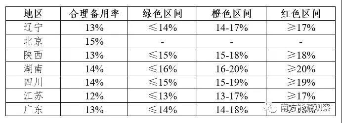 因?yàn)殡娋W(wǎng)規(guī)模、發(fā)用電結(jié)構(gòu)不同,各地的合理備用率有所差別,部分區(qū)域合理備用率如下表所示:
