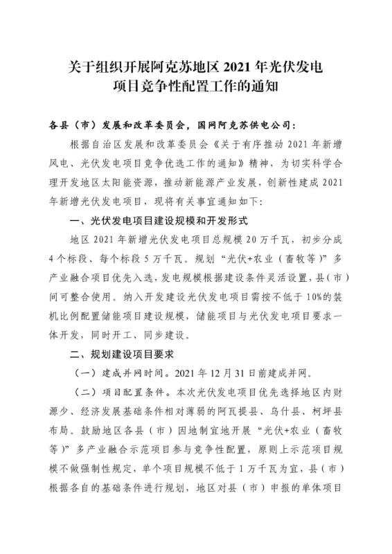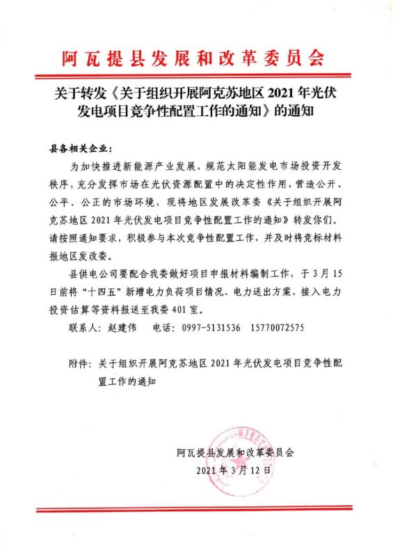 中國儲能網(wǎng)訊:近日,阿瓦提縣發(fā)改委轉發(fā)了《關于組織開展阿克蘇地區(qū)2021年光伏發(fā)電項目競爭性配置工作的通知》。