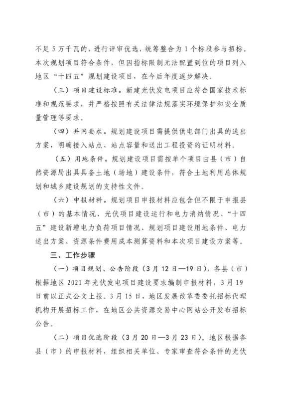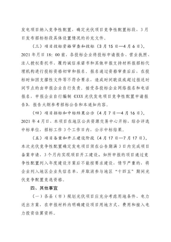 根據(jù)文件,3月12日—19 日為項目規(guī)劃、公告階段,各縣(市)根據(jù)地區(qū)2021 年光伏發(fā)電項目建設要求編制申報材料,3月19日前以正式公文上報。3月20日—3月23日為項目優(yōu)選階段,地區(qū)根據(jù)各縣(市)的申報材料,組織相關單位、專家審查符合條件的光伏發(fā)電項目納入競爭性配置,確定光伏項目競爭性配置標段。