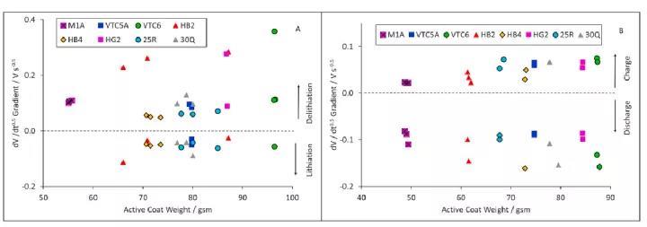 在初始電阻增加后,電極開始受擴(kuò)散限制;對(duì)于擴(kuò)散受限過程,電極電壓與t0.5成正比,進(jìn)而可計(jì)算有效擴(kuò)散系數(shù)(梯度)。如果是在固定的充電狀態(tài)下進(jìn)行,那么梯度(dE/dt0.5)應(yīng)該與電流成比例。電壓與t0.5的線性圖顯示了在±20 脈沖瞬態(tài)線性區(qū)域內(nèi)電壓相對(duì)于t0.5的梯度 (不包括48G電池的結(jié)果,其梯度遠(yuǎn)高于其他電池)。電壓與t0.5的梯度是從瞬態(tài)的初始線性段計(jì)算出來的。與ASI值不同的是,電壓與t0.5的梯度值在脈沖充放電時(shí)是不對(duì)稱的,對(duì)負(fù)極來講,鋰化時(shí)的梯度值比脫鋰時(shí)??;對(duì)于正極,充電時(shí)的梯度值小于放電時(shí)的值。