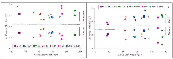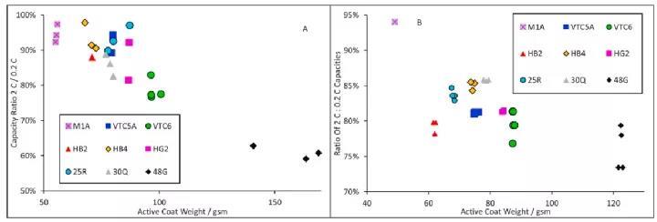 分析充放電速率的一種簡(jiǎn)易方法是繪制2C的放電容量與C/5容量的比值。如圖二所示:每種類型的電極至少制成了三個(gè)電池來進(jìn)行測(cè)試。這些點(diǎn)的分布表明,涂層重量和功率容量都有變化。這九種負(fù)極 (從M1A到48G)的2C/ C/5的容量比隨著涂層重量的增加有明顯的線性趨勢(shì)。擁有高功率: 能量比的電池通常具有較低的面積比容量,這與較低的涂層質(zhì)量有關(guān)。三星48G電池具有最大的能量密度,因此有最高的涂層質(zhì)量,和最差的2C快充性能。正極也展現(xiàn)了類似的2 C: C/5容量比與活性涂層質(zhì)量的關(guān)系:48G正極具有迄最高的涂層重量??傮w而言,正極的2C: C/5比值要比負(fù)極的低。