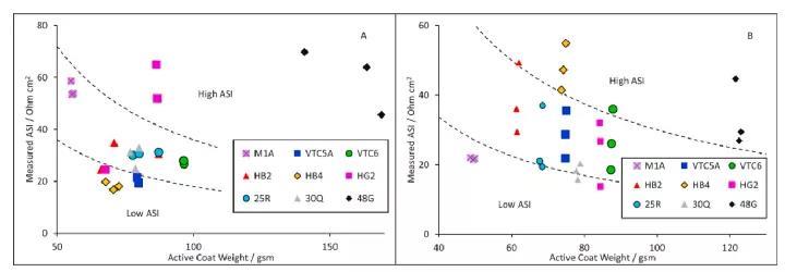 圖三:九種不同電池中拆解出來電極A)負(fù)極和B)正極進(jìn)行ASI測(cè)試