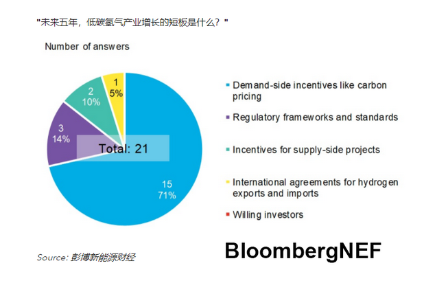 21個受訪者中有15人認為,需求方激勵措施是低碳氫氣在未來五年發(fā)展的關(guān)鍵缺失因素。與會者一致認為,碳定價至關(guān)重要,但清潔氫氣目前需要100-200歐元(121-242美元)/噸的碳價支撐,才能在部分領域具有競爭力,相當于目前歐盟碳價的2.5-5倍,與彭博新能源財經(jīng)《氫能經(jīng)濟展望》中的70-185歐元/噸的預測大致相當。
