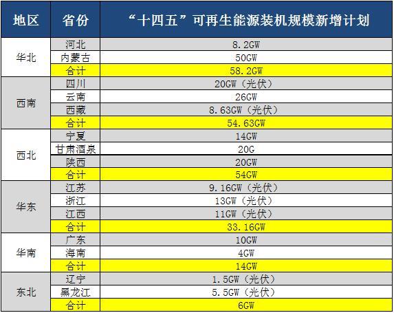 在省份層面,內(nèi)蒙古、云南、四川、甘肅酒泉、陜西等省份均對可再生能源的裝機新增規(guī)模進行重點投入,新能源裝機規(guī)模新增計劃分別為50GW、26GW、20GW、20GW、20GW。