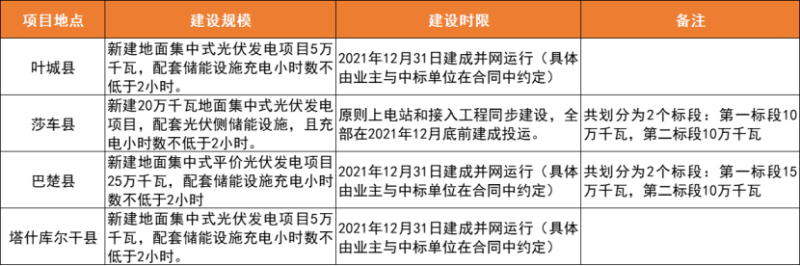 近日,新疆喀什地區(qū)葉城縣、莎車縣、巴楚縣、塔什庫爾干縣相繼發(fā)布2021年光伏發(fā)電和儲能設(shè)施項目競爭性配置工作招標(biāo)公告,共計550MW,均為地面集中式光伏發(fā)電項目。光伏們整理了項目基本情況,如下圖所示: