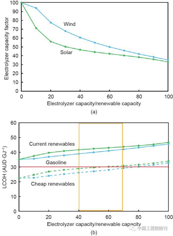要使電解器容量系數(shù)高而又不依賴于固化的另一種方法是,相對(duì)于供應(yīng)電解器的可再生能源而言,減小電解器的尺寸。如圖2所示,容量遠(yuǎn)小于可再生能源供應(yīng)的電解槽的容量系數(shù)趨于100%,而容量與可再生能源相同的電解器,具有與供應(yīng)可再生能源的電解槽相同的容量系數(shù)。盡管非常高的容量系數(shù)似乎很有吸引力,但小型電解槽幾乎不產(chǎn)生氫氣。鑒于我們的電力和運(yùn)輸燃料系統(tǒng)的規(guī)模相似,因此我們可以選擇生產(chǎn)相似數(shù)量的兩者,如圖2(b)中的黃色方框所示。