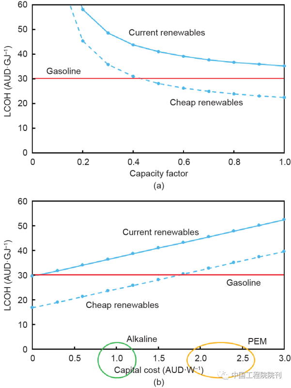 圖1 氫氣的平均成本(LCOH)與堿性電解器的容量因子(a)和容量因子為75%的成本以及近似的堿性和PEM成本(b)