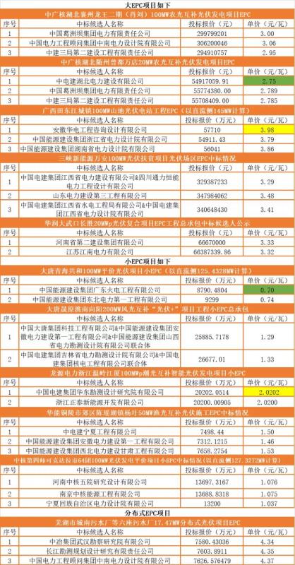 近日,中廣核、大唐、龍?jiān)措娏?、三峽、華潤、華能等企業(yè)共計(jì)約1GW的光伏電站EPC項(xiàng)目相繼公示了中標(biāo)候選人。其中,包含組件、逆變器等關(guān)鍵設(shè)備的大EPC項(xiàng)目385MW,不含組件、逆變器等關(guān)鍵設(shè)備的小EPC項(xiàng)目約為602MW,大部分為光伏復(fù)合項(xiàng)目。此外還包含部分分布式項(xiàng)目EPC中標(biāo)情況??傮w來看,盡管組件價(jià)格不斷上漲,但與春節(jié)前相比(點(diǎn)擊查看《2021年1.7GW光伏EPC項(xiàng)目中標(biāo)價(jià)格一覽》,此次EPC的報(bào)價(jià)卻有走低的趨勢。