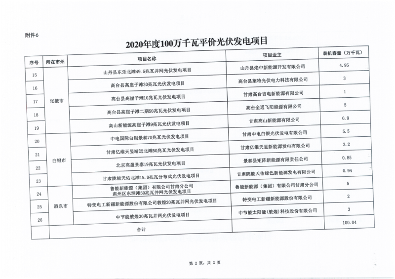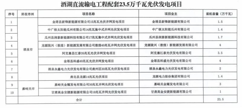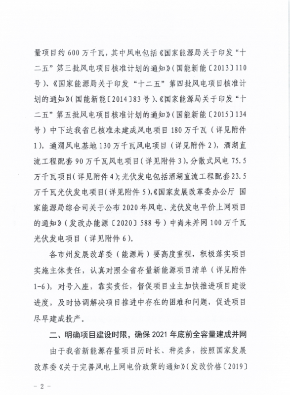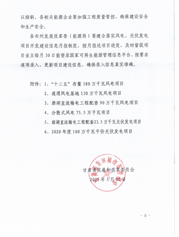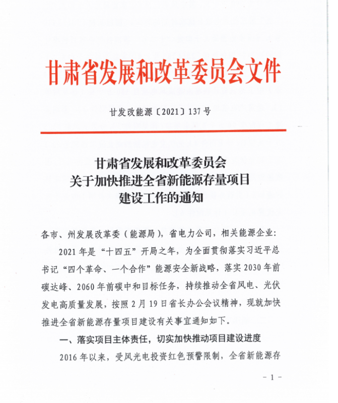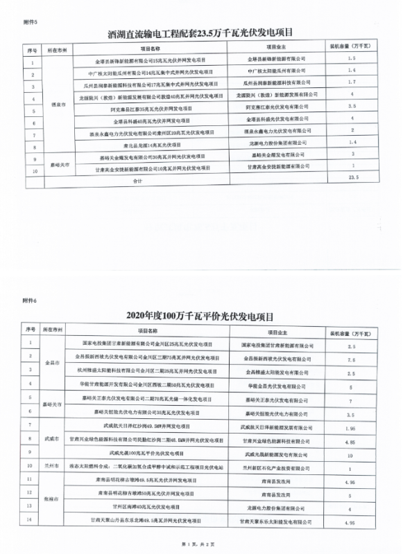 3月25日,甘肅省發(fā)改委發(fā)布《關(guān)于加快推進(jìn)全省新能源存量項(xiàng)目建設(shè)工作》的通知。文件明確,甘肅省目前新能源存量項(xiàng)目約600萬千瓦。其中,光伏發(fā)電項(xiàng)目1.23GW包括:酒湖直流工程配套23.5萬千瓦光伏發(fā)電項(xiàng)目以及《國家發(fā)展改革委辦公廳國家能源局綜合司關(guān)于公布2020年風(fēng)電、光伏發(fā)電平價(jià)上網(wǎng)項(xiàng)目的通知》(發(fā)改辦能源〔2020〕588號(hào))中尚未并網(wǎng)100萬千瓦光伏發(fā)電項(xiàng)目。