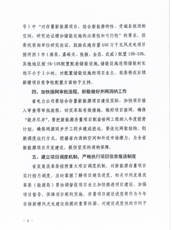 此外,文件還明確鼓勵(lì)配置儲(chǔ)能設(shè)施,鼓勵(lì)全省在建存量600萬千瓦風(fēng)光電項(xiàng)目按河西5市(酒泉、嘉峪關(guān)、張掖、金昌、武威)配置10%-20%、其他地區(qū)按5%-10%配置配套儲(chǔ)能設(shè)施,儲(chǔ)能設(shè)施連續(xù)儲(chǔ)能時(shí)長均不小于2小時(shí)。對配置儲(chǔ)能設(shè)施的項(xiàng)目業(yè)主,甘肅省發(fā)改委將在后續(xù)新增項(xiàng)目競爭性配置方面給予支持。
