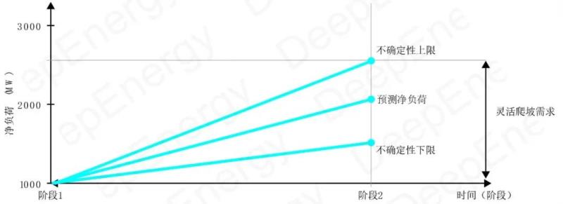FRP是一種輔助服務(wù)并且常有兩個(gè)獨(dú)立的產(chǎn)品,一個(gè)是爬坡調(diào)節(jié),叫做靈活爬坡(FRU),另一種是降坡調(diào)節(jié),叫做靈活降坡(FRD)。這種產(chǎn)品可以綜合需求和VRE的調(diào)節(jié)要求,將凈負(fù)荷偏差考慮進(jìn)來,然后反映出調(diào)節(jié)預(yù)測的不確定性。在預(yù)測上,像電網(wǎng)系統(tǒng)其他備用要求一樣,F(xiàn)RP試圖將需求和VRE的預(yù)測偏差考慮進(jìn)來。圖3給出了一個(gè)示例,在給定凈負(fù)荷曲線和預(yù)測不確定度時(shí),F(xiàn)RP的調(diào)節(jié)要求是怎樣的。
