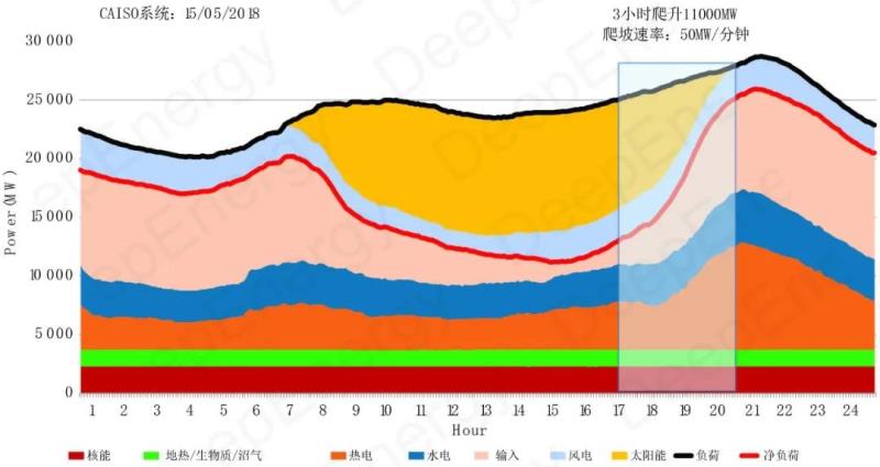 降坡調(diào)節(jié)發(fā)生在日出后早7點(diǎn)左右,此時(shí)太陽能發(fā)電開始替代傳統(tǒng)發(fā)電。在下午5點(diǎn)左右太陽下山時(shí),太陽能發(fā)電停止,電網(wǎng)運(yùn)營商必須調(diào)度資源來滿足第三次也是最陡峭的日常調(diào)節(jié),大約需要在3小時(shí)內(nèi)調(diào)度1100MW的發(fā)電能力來滿足需求。這需要系統(tǒng)有50MW/分鐘的爬坡能力和非常靈活的電力系統(tǒng)。