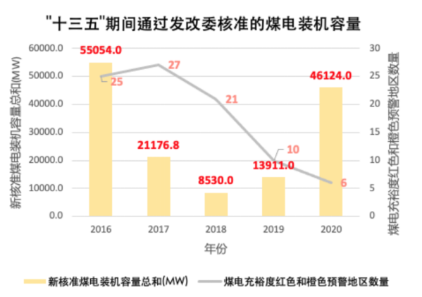 早在2016年,中國國家發(fā)改委和國家能源局就已實施建立煤電風險預警機制以約束煤電裝機核準規(guī)模。為消解在“十二五”時期核準通過的大量煤電,2016~2018年,各地方通過核準的煤電裝機容量一度大幅下降。然而,在“十三五”后半期,即2019~2020年,煤電項目核準再次出現(xiàn)逐年上升的趨勢。2020年一年內新通過發(fā)改委核準的煤電裝機總量為46.1GW,占“十三五”期間通過發(fā)改委核準總和的約31.9%。