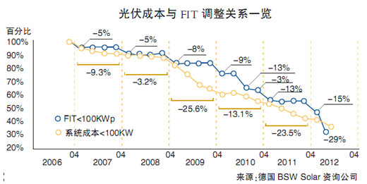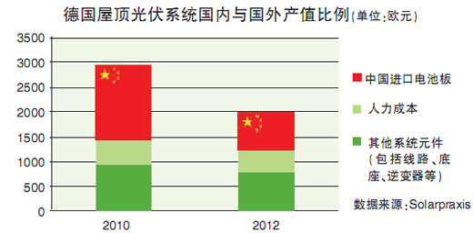 德國根本不用擔心國內(nèi)市場。以2010年為例,當年德國屋頂太陽能組件的市場價格約為2900歐元/千瓦。據(jù)柏林一家頂尖的可再生能源工程服務(wù)公司Solarpraxis統(tǒng)計,在德國安裝的屋頂光伏系統(tǒng)中,線路、底座和逆變器多半是國內(nèi)原產(chǎn),這些部分占了整個系統(tǒng)造價的近一半。目前從中國進口的太陽能電池板造價已經(jīng)跌到700歐元/千瓦,但上述其他組件價格卻沒怎么大跌。如此推算,德國國內(nèi)市場份額實際上在不斷擴大,電池板在裝機成本中所占比例已經(jīng)下降了許多。