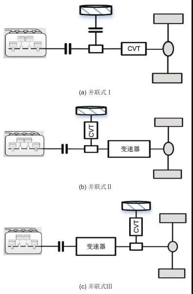 圖9(a)并聯(lián)式Ⅰ中發(fā)動(dòng)機(jī)與飛輪通過離合器與動(dòng)力耦合器耦合或解耦,低負(fù)荷時(shí)發(fā)動(dòng)機(jī)可以運(yùn)行在經(jīng)濟(jì)區(qū)域內(nèi),并同時(shí)為飛輪充電;大負(fù)荷時(shí),飛輪可為發(fā)動(dòng)機(jī)提供額外的后備功率。該結(jié)構(gòu)形式缺點(diǎn)是飛輪的轉(zhuǎn)速不可調(diào),且動(dòng)力耦合輸出時(shí)控制策略相對(duì)復(fù)雜。并聯(lián)式Ⅱ中發(fā)動(dòng)機(jī)功率點(diǎn)可通過CVT調(diào)節(jié),發(fā)動(dòng)機(jī)運(yùn)行在經(jīng)濟(jì)區(qū)域內(nèi),且飛輪轉(zhuǎn)速可調(diào),但CVT的存在會(huì)降低能量轉(zhuǎn)換效率。并聯(lián)式Ⅲ中飛輪及CVT置于變速器后方,便于與現(xiàn)有的傳動(dòng)系統(tǒng)集成及實(shí)現(xiàn)制動(dòng)能量回收,但發(fā)動(dòng)機(jī)功率點(diǎn)不易調(diào)節(jié)。