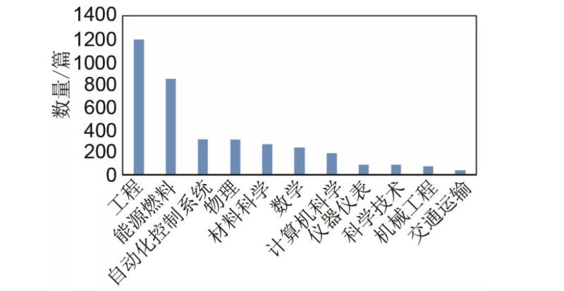 圖5表明,自2000年后關(guān)于飛輪儲(chǔ)能技術(shù)的文獻(xiàn)發(fā)表量呈線性增加趨勢,且2018年達(dá)到124篇,這與EI數(shù)據(jù)庫的統(tǒng)計(jì)趨勢一致。將1316條按研究方向精煉檢索后得到圖6,其中工程方向論文檢索量為1194條,其次是能量燃料845條,自動(dòng)化控制系統(tǒng)311條,機(jī)械工程文獻(xiàn)檢索量為74條,交通運(yùn)輸方向39條。上述檢索數(shù)據(jù)表明汽車用飛輪儲(chǔ)能技術(shù)方向的文獻(xiàn)發(fā)表量同中國知網(wǎng)(CNKI)及EI數(shù)據(jù)庫的文獻(xiàn)發(fā)表數(shù)量基本一致,即國內(nèi)外發(fā)展趨勢一致。