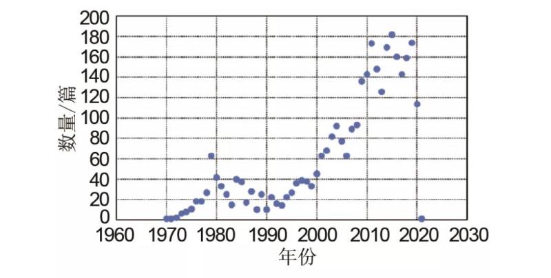 以“All fields”中包含“flywheel energy storage”為檢索手段,共檢索到3180條記錄(1970—2021年),各年份論文發(fā)表數(shù)量如圖3所示。2000年之前,關(guān)于飛輪儲(chǔ)能的文獻(xiàn)年發(fā)表量低于50篇,2000年以后發(fā)表的文獻(xiàn)量快速增加。