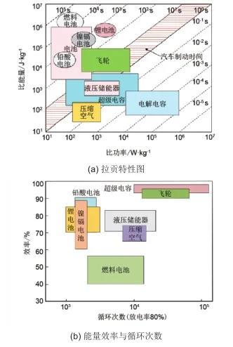 拉貢特性圖可以對(duì)儲(chǔ)能裝置比功率和比能量進(jìn)行初始評(píng)估,并依照比能量與比功率的比值定義放電時(shí)間,即圖1(a)中的虛對(duì)角線,每條虛對(duì)角線上的充放電持續(xù)時(shí)間相等,通過充放電持續(xù)時(shí)間的識(shí)別確定所選擇的儲(chǔ)能裝置是否能夠以最小質(zhì)量滿足能量或功率需求。此外,能量效率和預(yù)期循環(huán)次數(shù)也可以評(píng)估儲(chǔ)能裝置的儲(chǔ)能特性,如圖1(b)所示,放電深度為80%時(shí),超級(jí)電容和飛輪的能量效率可達(dá)到95%,循環(huán)次數(shù)超過10000次,電池的能量效率約為60%~90%,循環(huán)次數(shù)為1000~4000次,燃料電池能量效率低,但循環(huán)次數(shù)相對(duì)較長。目前,動(dòng)力電池和超級(jí)電容作為汽車用的主流儲(chǔ)能裝置,可滿足車輛不同工況下的能量需求,但無法同時(shí)兼顧比功率和比能量要求;而飛輪能夠以相對(duì)較高的比能量和比功率滿足上述需求,且循環(huán)壽命和能量效率較高。