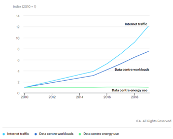大型科技公司擁有重要的經(jīng)驗(yàn)和技能。作為減少直接碳足跡的努力的一部分,他們已經(jīng)認(rèn)真審視了自己的運(yùn)營(yíng)。近年來(lái),由于計(jì)算和基礎(chǔ)設(shè)施的效率提高,以及云計(jì)算和超大規(guī)模數(shù)據(jù)中心的份額增加,數(shù)據(jù)使用、互聯(lián)網(wǎng)流量和電力使用之間出現(xiàn)了顯著的分離。然而,隨著大型科技公司超大規(guī)模數(shù)據(jù)中心的能源使用量迅速增長(zhǎng),需要更強(qiáng)有力的能效提升,以限制未來(lái)10年的能源需求增長(zhǎng)。