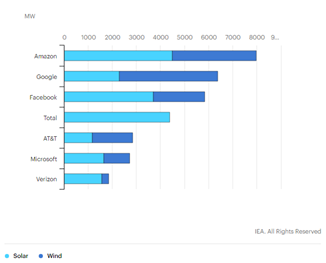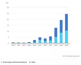 大型科技公司率先為可再生能源簽訂了企業(yè)電力購(gòu)買協(xié)議(PPAs)。2020年,五大科技公司采購(gòu)了7.2GW的可再生能源裝機(jī)容量,占所有企業(yè)可再生能源PPAs的近30%,約占全球新增可再生能源裝機(jī)容量的3.5%。在美國(guó)的大型科技公司中,承諾從可再生能源獲取與年度消費(fèi)量相同數(shù)量的電力已成為標(biāo)準(zhǔn)。