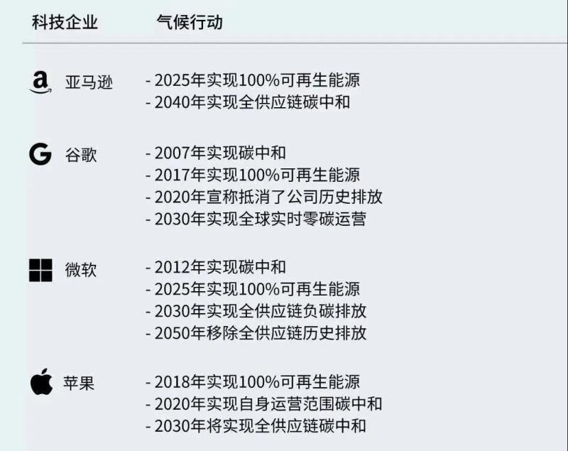 數(shù)據(jù)中心的市場(chǎng)前景廣闊,但同時(shí)對(duì)能耗和減排也提出了更高的挑戰(zhàn)。2018年中國(guó)數(shù)據(jù)中心總用電量為1609億千瓦時(shí),約占中國(guó)全社會(huì)用電量的2%,總碳排放量達(dá)到9855萬(wàn)噸,預(yù)計(jì)到2023年,中國(guó)數(shù)據(jù)中心總碳排放將達(dá)到1.63億噸[15]。在中央于2020年9月提出“雙碳”目標(biāo)后,科技公司對(duì)于電力采購(gòu)的規(guī)劃深受中央指引影響。目前,包括騰訊和螞蟻集團(tuán)等互聯(lián)網(wǎng)科技企業(yè)已陸續(xù)提出啟動(dòng)碳中和規(guī)劃。而早在2018年 ,國(guó)際互聯(lián)網(wǎng)企業(yè)蘋(píng)果、谷歌就已實(shí)現(xiàn)100%可再生能源目標(biāo)。使用清潔電源供應(yīng)、實(shí)現(xiàn)全供應(yīng)鏈凈零碳排放早已成為這些數(shù)字科技企業(yè)的重要綠色名牌。