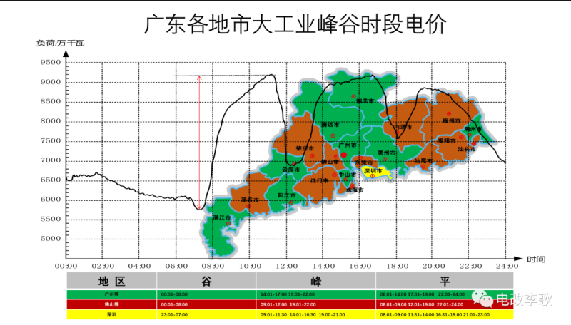 我們發(fā)現(xiàn),除了深圳地區(qū)外,廣東其他各地峰谷時段劃分跟負荷峰谷并不匹配。通過追究歷史發(fā)現(xiàn),2003年峰谷電價出臺之初,峰谷電價時段跟負荷峰谷時段是匹配的。估計執(zhí)行1年多后,大部分企業(yè)無法根據(jù)電價調(diào)整用電,如果白班都是高電價時段,那么企業(yè)電價負擔不輕,為了營造良好的營商環(huán)境,2005年進行了調(diào)整,采取分批錯峰,一直沿用到現(xiàn)在。
