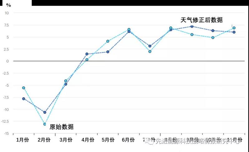 受疫情和封控措施的實施,中國2020年1月電力需求呈現(xiàn)下降趨勢,2月份降幅更大(經(jīng)閏年修正后,較2019年同期下降13%)。由于2020年2月份氣溫高于2019年同期,經(jīng)天氣修正后,2020年2月電力需求仍較2019年同期水平下降11%。隨著疫情好轉(zhuǎn),封控措施的放松,中國電力需求呈現(xiàn)復(fù)蘇跡象。到2020年4月,中國電力需求完全恢復(fù)至疫情前水平。8月,經(jīng)天氣修正后,電力需求較2019年同期水平增長了6%。具體變化如圖2所示。