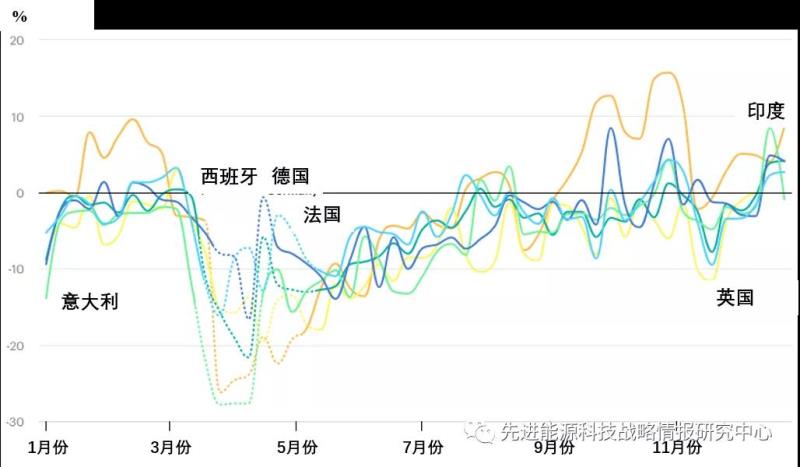 圖1 2020年部分國家每周電力需求(經(jīng)天氣修正)同比變化(單位:%)