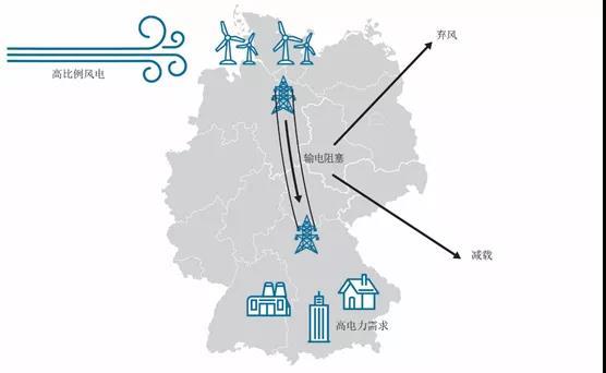 最知名的因電網(wǎng)阻塞導(dǎo)致VRE棄電的案例是德國電網(wǎng)的例子。德國三分之二的陸上風(fēng)電,和所有的海上風(fēng)電場(chǎng)都在德國的北部,但是工業(yè)用戶都位于南部。多年以來,德國電網(wǎng)并沒有足夠的電網(wǎng)容量來將北部的風(fēng)電輸送到南部,因而阻塞經(jīng)常發(fā)生。這導(dǎo)致北部發(fā)生了風(fēng)電棄電,南部熱力發(fā)電廠的高污染和昂貴電力消費(fèi)還在攀升。這引起整體用能成本上升,見圖1。