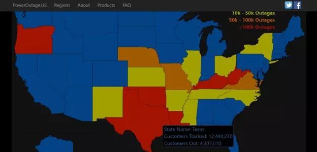 整個得州的氣溫一直處于0℃以下,溫度為-3.9℃至-26℃。歷史性的低溫讓全州電力短缺,得州處于最高能源應急級別,創(chuàng)下了創(chuàng)紀錄的6920萬千瓦冬季用電高峰——人均超過2千瓦。很多地區(qū)不得不滾動供電,至少250萬戶家庭停電。