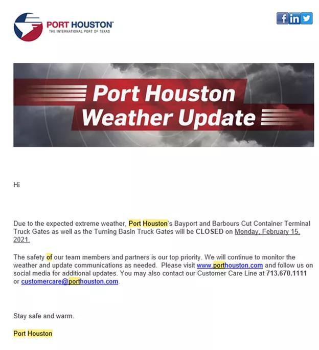 孟靜惟:2月12日下午,工作原因收到了休斯頓港口周一停運的郵件,一批物資正卡在港口,焦頭爛額調整生產計劃擔心物資短缺。下班時間收到通知需要帶上工作電腦回家以防周一有雪可在家辦公。