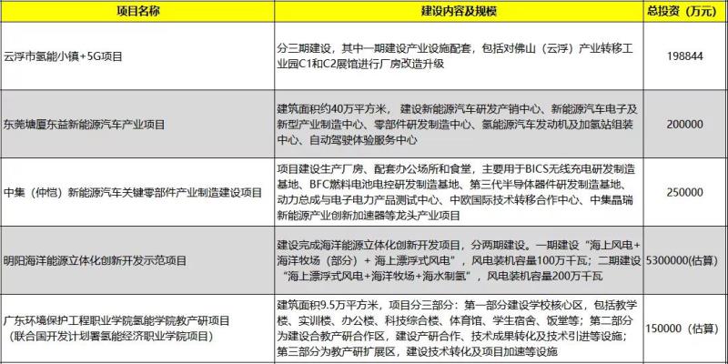 五個(gè)氫能項(xiàng)目包括:①重大發(fā)展平臺(tái)項(xiàng)目:云浮市氫能小鎮(zhèn)項(xiàng)目(投資約20億元);②汽車制造項(xiàng)目:東莞塘廈氫能源汽車發(fā)動(dòng)機(jī)及加氫站組裝中心項(xiàng)目(投資為20億元);③電子信息項(xiàng)目:中集(仲愷)BFC燃料電池電控研發(fā)制造基地(投資為25億元);④能源工程項(xiàng)目:明陽(yáng)海洋能源立體化創(chuàng)新開(kāi)發(fā)示范項(xiàng)目(投資估算530億元);⑤氫能學(xué)院教產(chǎn)研項(xiàng)目:廣東環(huán)境保護(hù)工程職業(yè)學(xué)院氫能學(xué)院教產(chǎn)研項(xiàng)目(投資估算15億元)。