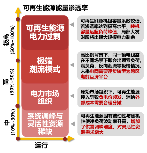 在運行時間尺度上,可再生能源帶來的一系列挑戰(zhàn)源自于其固有波動性與隨機(jī)性。風(fēng)光可再生能源電源出力上限通常不可調(diào)度,系統(tǒng)調(diào)峰與電力市場組織問題,在中比例滲透階段的時候便會出現(xiàn),隨著滲透率的增加,問題逐漸凸顯。極端潮流模式與大發(fā)電力過剩的問題,在高比例與極高比例滲透階段才會出現(xiàn)。高比例可再生能源滲透對系統(tǒng)經(jīng)濟(jì)安全運行的挑戰(zhàn)總結(jié)如圖3所示。
