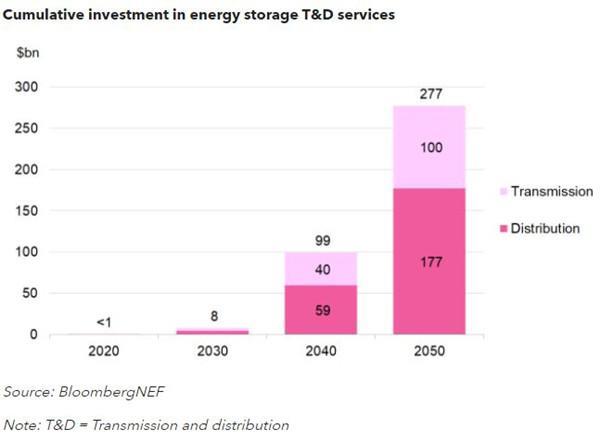 中國(guó)儲(chǔ)能網(wǎng)訊:由于電池成本的下降,電池存儲(chǔ)項(xiàng)目相對(duì)于新的輸電項(xiàng)目更具競(jìng)爭(zhēng)力。彭博社新能源預(yù)計(jì),提供輸配電服務(wù)的儲(chǔ)能項(xiàng)目在2020年至2050年之間的市場(chǎng)規(guī)模將達(dá)到2770億美元。