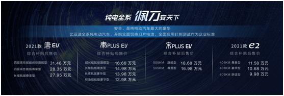 此次發(fā)布會(huì)上,2021款唐EV、秦PLUS EV、宋PLUS EV及2021款 e2四款純電車型全面切換搭載刀片電池也集中亮相。其中2021款唐EV綜合補(bǔ)貼后價(jià)格為27.95萬(wàn)元-31.48萬(wàn)元,秦PLUS EV綜合補(bǔ)貼后價(jià)格為12.98萬(wàn)元-16.68萬(wàn)元,宋PLUSEV綜合補(bǔ)貼后價(jià)格為16.98萬(wàn)元-18.68萬(wàn)元,2021款e2綜合補(bǔ)貼后價(jià)格為9.98萬(wàn)元-11.58萬(wàn)元。