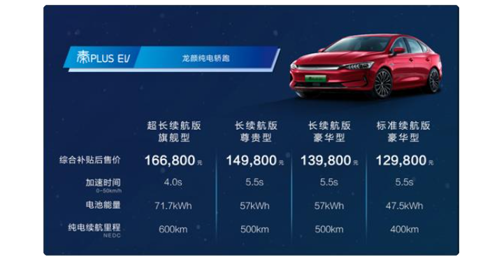秦PLUS EV作為一款龍顏純電轎跑,延續(xù)大放異彩的EVDragon Face設(shè)計(jì)語(yǔ)言,龍須飛揚(yáng)、龍睛銳利。游龍躍動(dòng)腰線搭配龍騰溜背造型,整體線條飽滿靈動(dòng),宛如游龍,氣勢(shì)磅礴。佩刀而來(lái)的秦PLUS EV以快和遠(yuǎn),成為同級(jí)車中的性能表率,同時(shí)擺脫了里程束縛和充電焦慮。0到50公里加速快至4秒,遠(yuǎn)超同級(jí)的600km超長(zhǎng)續(xù)航,百公里電耗低至12.9kWh。充電一次、通勤兩周。30分鐘直流快充,電量即可從30%充至80%。秦PLUS EV綜合補(bǔ)貼后價(jià)格為12.98萬(wàn)元-16.68萬(wàn)元。