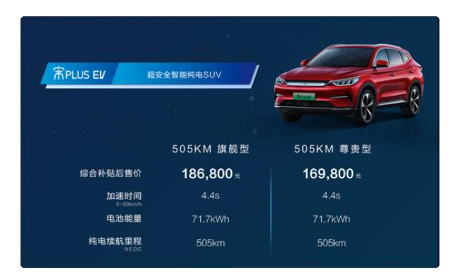 宋PLUS EV為一線都市精英而來(lái),是一款超安全智能純電SUV。它延續(xù)了“寬體低趴”的造型風(fēng)格,擁有新B級(jí)大軸距奢享空間。佩刀升級(jí)的宋 PLUS EV配合全新一代智能溫控系統(tǒng),及德系豪車底盤(pán)調(diào)校,輕松突破505km續(xù)航,0到50km加速時(shí)間快至4.4秒。全系配備360°高清全景影像系統(tǒng)、全息透明影像系統(tǒng)、智能遙控駕駛、新能源專屬的移動(dòng)電站、VTOL 220V電源輸出等超智能科技配置,引領(lǐng)使用價(jià)值新高度!宋PLUS EV綜合補(bǔ)貼后價(jià)格為16.98萬(wàn)元-18.68萬(wàn)元。